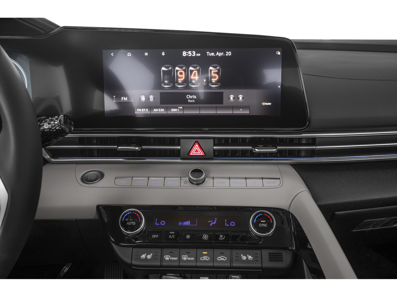 - Radio: AM/FM/HD/SiriusXM Display Audio -inc: 10.25" high resolution touchscreen display, navigation, SirusXM data services: NavTraffic, NavWeather and Sports and Stocks w/3-month trial, Bose premium audio w/8 speakers, center channel and subwoofer, Blue Link connected car system, wired Apple CarPlay & Android Auto, Bluetooth® hands-free phone system w/voice recognition, USB port, dynamic voice recognition and speed-sensitive automatic volume control