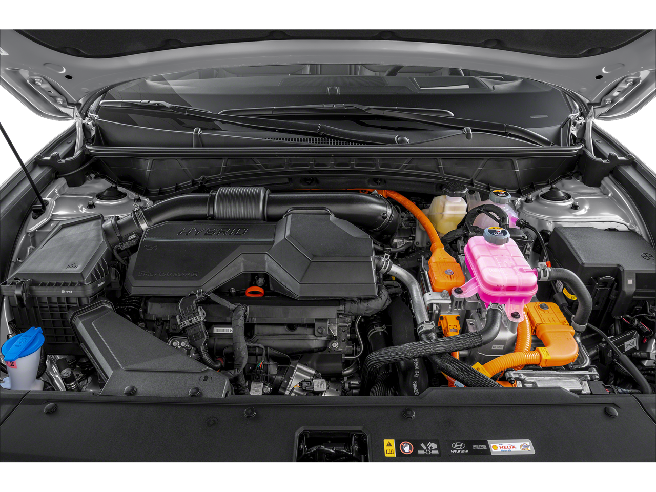 1.6L I4 DGI Hybrid Turbocharged DOHC 16V LEV3-SULEV30. Option Group 01, 1.6L I4 DGI Hybrid Turbocharged DOHC 16V LEV3-SULEV30, 19 Alloy Wheels, 4-Wheel Disc Brakes, 8 Speakers, ABS brakes, Air Conditioning, All Season Fitted Liners, Alloy wheels, AM/FM radio: SiriusXM, Apple CarPlay & Android Auto, Auto High-beam Headlights, Auto-dimming Rear-View mirror, Automatic temperature control, Brake assist, Bumpers: body-color, Cargo Cover, Cargo Net, Cargo Tray, Carpeted Floor Mats, Cross Rails, Delay-off headlights, Driver door bin, Driver vanity mirror, Dual front impact airbags, Dual front side impact airbags, Electronic Stability Control, Emergency communication system: Bluelink+, First Aid Kit, Four wheel independent suspension, Front anti-roll bar, Front Bucket Seats, Front Center Armrest, Front dual zone A/C, Front reading lights, Fully automatic headlights, Garage door transmitter: HomeLink, Heads-Up Display, Heated & Ventilated Front Bucket Seats, Heated door mirrors, Heated front seats, Heated rear seats, Heated steering wheel, Illuminated entry, Leather steering wheel, Leather-Trimmed Seat Trim, Low tire pressure warning, Memory seat, Navigation System, Occupant sensing airbag, Outside temperature display, Overhead airbag, Overhead console, Panic alarm, Passenger door bin, Passenger vanity mirror, Power door mirrors, Power driver seat, Power Liftgate, Power moonroof, Power passenger seat, Power steering, Power windows, Radio data system, Radio: Bose Premium w/AM/FM/HD Audio System, Rain sensing wipers, Rear anti-roll bar, Rear reading lights, Rear seat center armrest, Rear side impact airbag, Rear window defroster, Rear window wiper, Remote keyless entry, Security system, Speed control, Split folding rear seat, Spoiler, Steering wheel mounted audio controls, Tachometer, Telescoping steering wheel, Tilt steering wheel, Traction control, Trip computer, Turn signal indicator mirrors, Variably intermittent wipers, and Ventilated front seats.